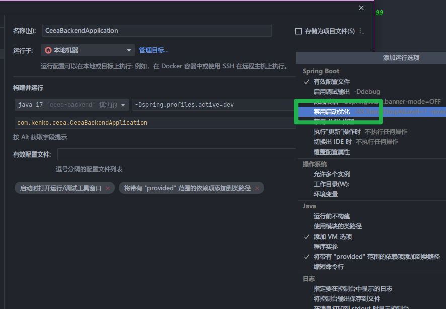 后端开发JDK13以上禁用启动优化本页总览JDK13以上禁用启动优化使用 JDK13 及以上版本时启动 Java 项目提示 OpenJDK 64-Bit Server VM warning: Options -Xverify:none and -noverify were deprecated in JDK 13 and will likely be removed in a future release. 经查启动时包含参数 -noverify ,启动项目时去掉该参数即可。 IDEA示例 添加运行选项:禁用启动优化