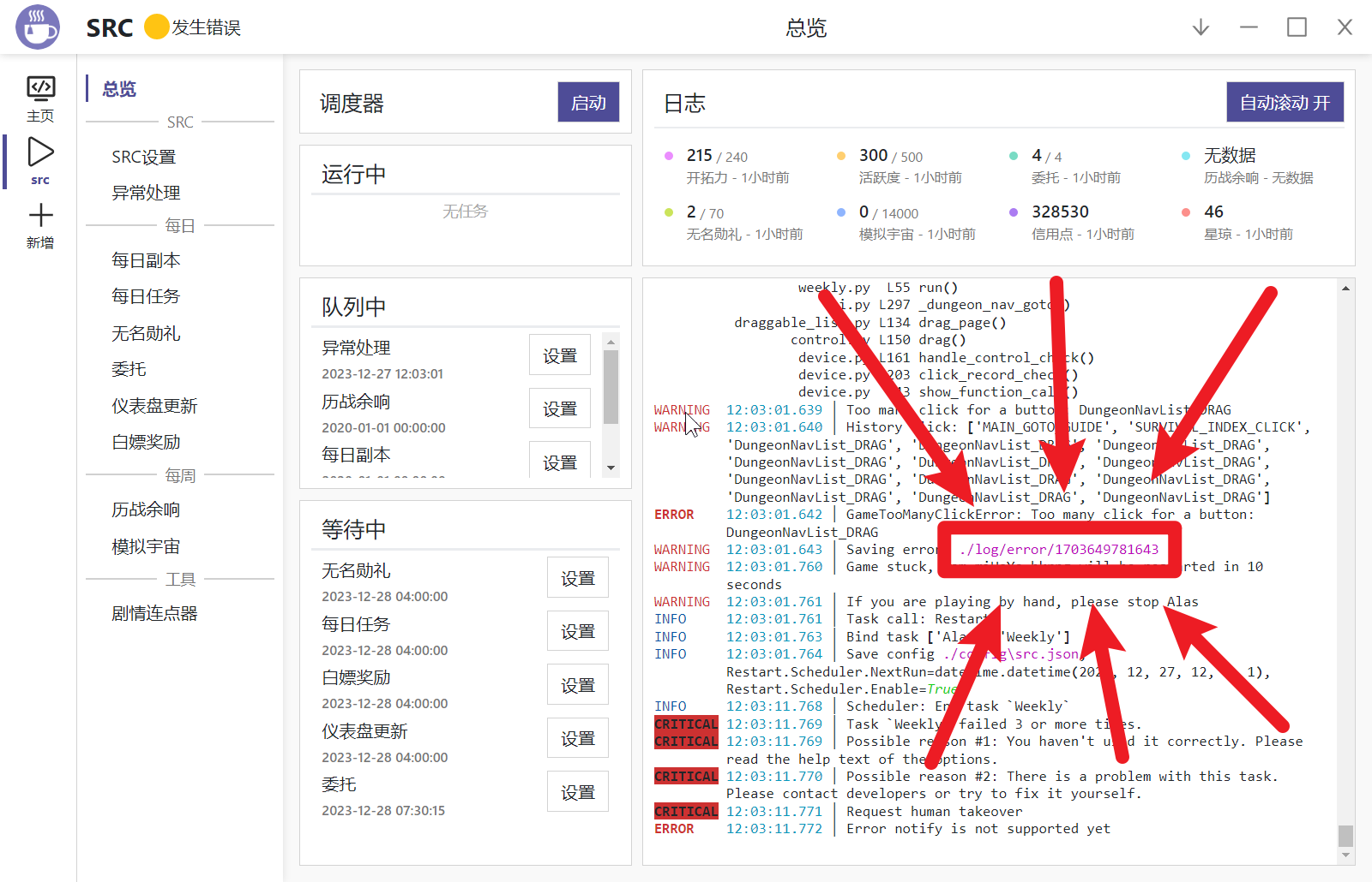 若不是错误而是非预期的行为,可以在 log 目录下找到文件名以当天日期起始的如 2023-04-01_src.txt 文件并提供一些游戏截图。